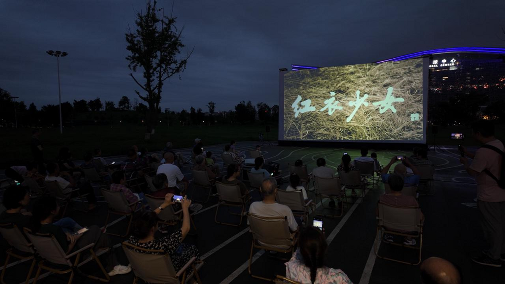 露天电影的银幕在璀璨灯光中熠熠生辉