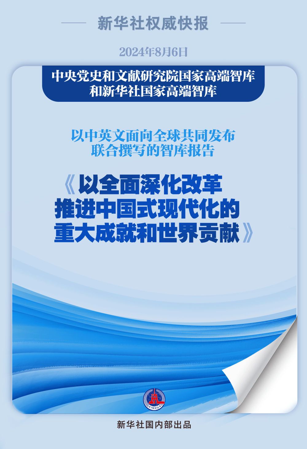 “红厅论坛:读懂中国共产党二十届三中全会”主题研讨会8月6日在中国共产党历史展览馆红色大厅举行。会上,中央党史和文献研究院国家高端智库和新华社国家高端智库以中英文面向全球共同发布联合撰写的智库报告《以全面深化改革推进中国式现代化的重大成就和世界贡献》。