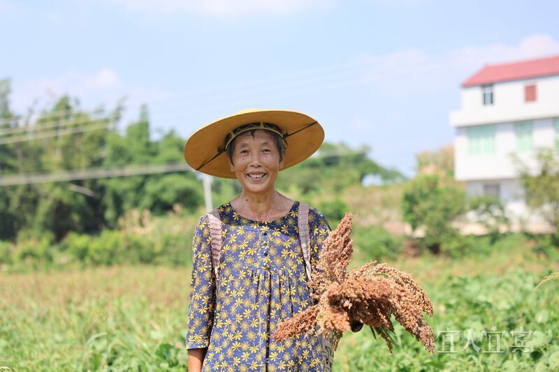 8月1日,在南溪粮油现代农业园区成片高粱地里,火红的高粱穗压弯枝头,株株颗粒饱满,联合收割机轰鸣运作,村民赵大芬紧随收割机之后,捡拾遗落的高粱穗,确保颗粒归仓。