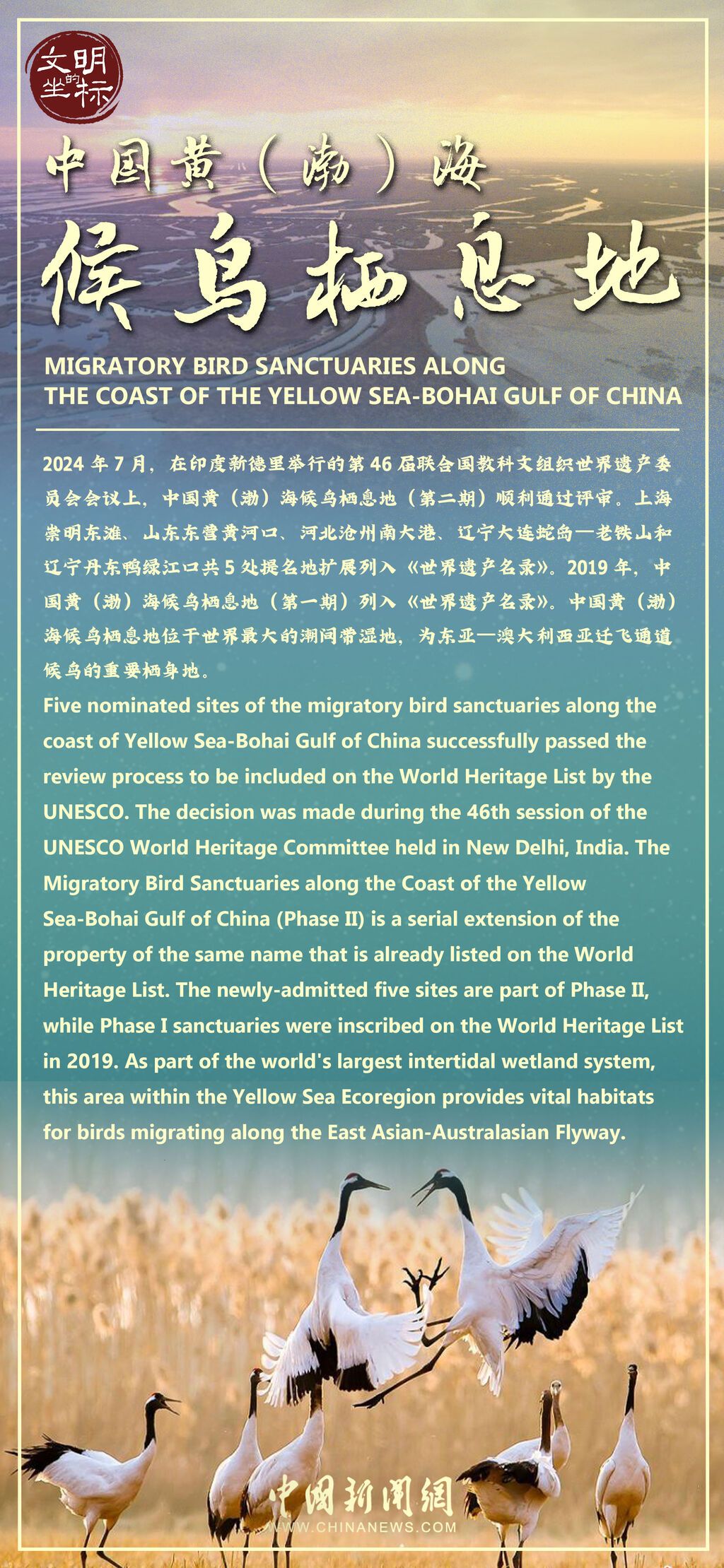 鸟类,是大自然最灵动的飞羽精灵,地球上生活的鸟类超过1/3具有迁徙的习性。中国黄(渤)海候鸟栖息地位于世界最大的潮间带湿地,为东亚—澳大利西亚迁飞通道候鸟的重要栖身地。这条迁徙通道是全球鸟类多样性最丰富、濒危物种比例最高的迁飞通道,为数千万只水鸟提供了不可或缺的繁殖地、停歇地和越冬地。2019年,中国黄(渤)海候鸟栖息地(第一期)列入《世界遗产名录》。今年7月,在第46届联合国教科文组织世界遗产委员会会议上,中国黄(渤)海候鸟栖息地(第二期)顺利通过评审,上海崇明东滩等五处提名地扩展列入《世界遗产名录》。待观鸟季,来这里邂逅美丽精灵,听候鸟啼鸣, 观雁飞鹤舞。