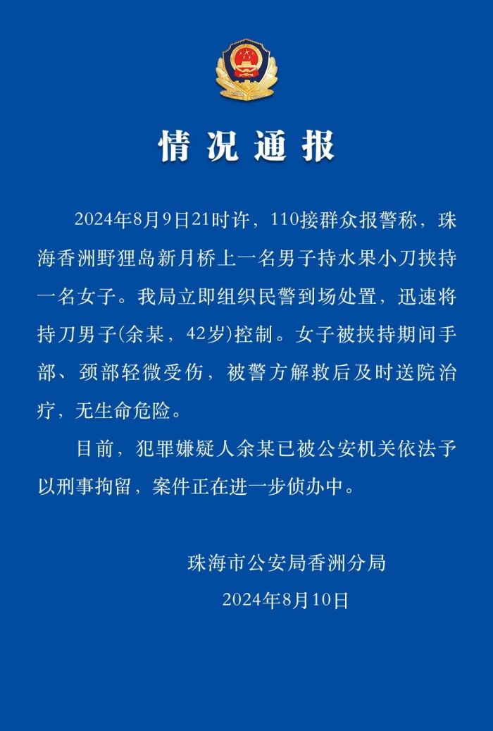 ·男子持水果小刀挟持女子,珠海警方通报。