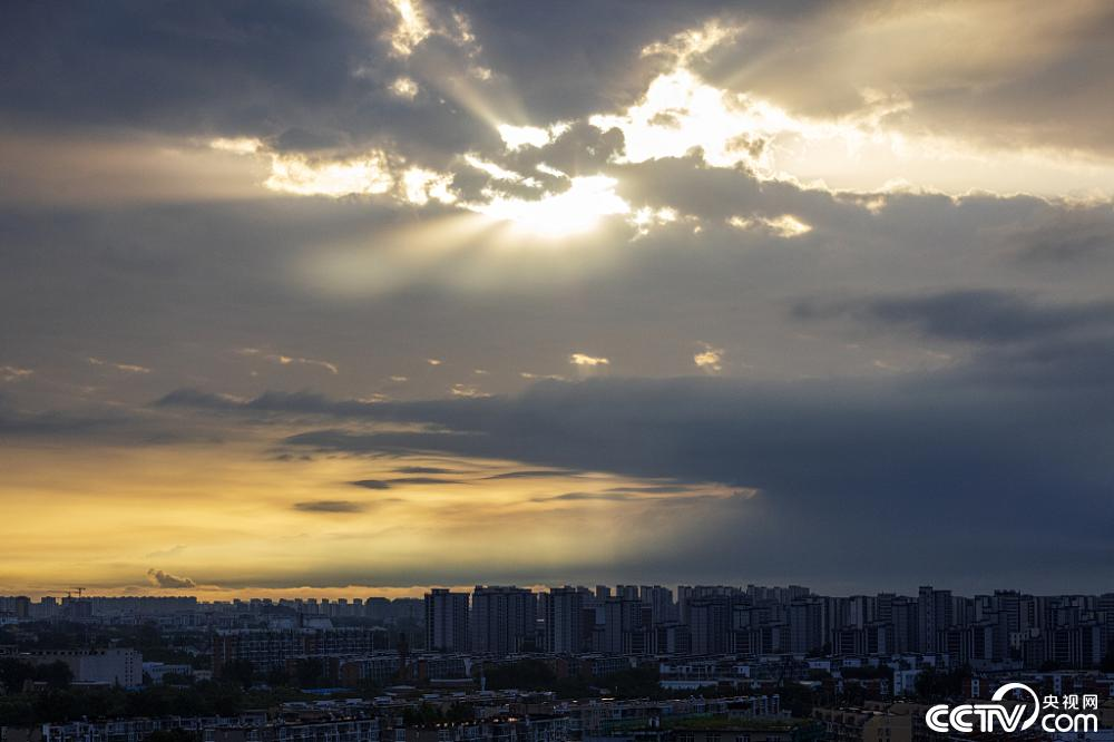 北京:雨后清晨,日出金光映照天际。