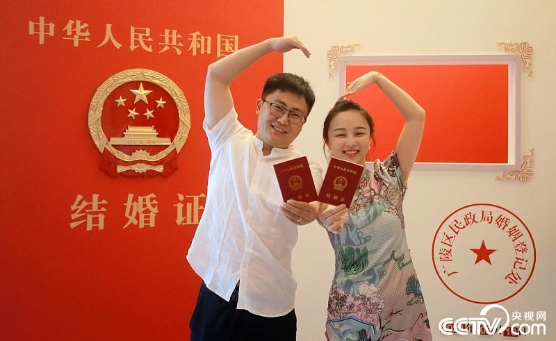 2024年8月10日,在江苏省扬州市广陵区民政局婚姻登记处,一对新人展示刚领到的结婚证。