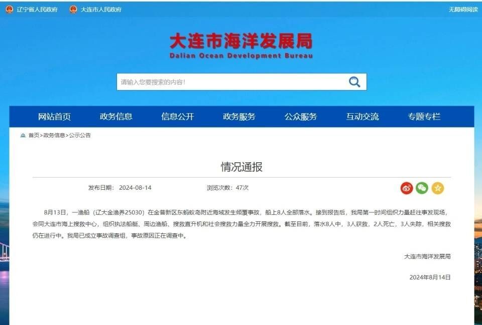 8月14日,大连市海洋发展局发布通报:8月13日,一渔船(辽大金渔养25030)在金普新区东蚂蚁岛附近海域发生倾覆事故,船上8人全部落水。接到报告后,我局第一时间组织力量赶往事发现场,会同大连市海上搜救中心,组织执法船艇、周边渔船、搜救直升机和社会搜救力量全力开展搜救。截至目前,落水8人中,3人获救,2人死亡,3人失踪,相关搜救仍在进行中。我局已成立事故调查组,事故原因正在调查中。