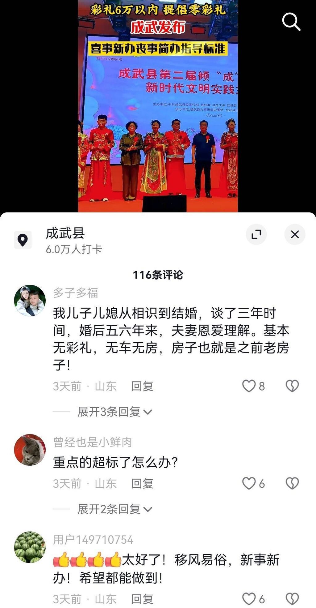封面新闻记者注意到,不少网友对这样的倡导表示欢迎,也有网友对执行情况表示了担忧。对此,成武县融媒体中心报道了该县大庄村的优秀经验:该村制定村规村约,成立红白理事会,向村民广泛宣传获得村民支持,减少了铺张浪费和彩礼攀比,村里两对夫妻率先喜事新办、零彩礼结婚,小日子至今过得很幸福。