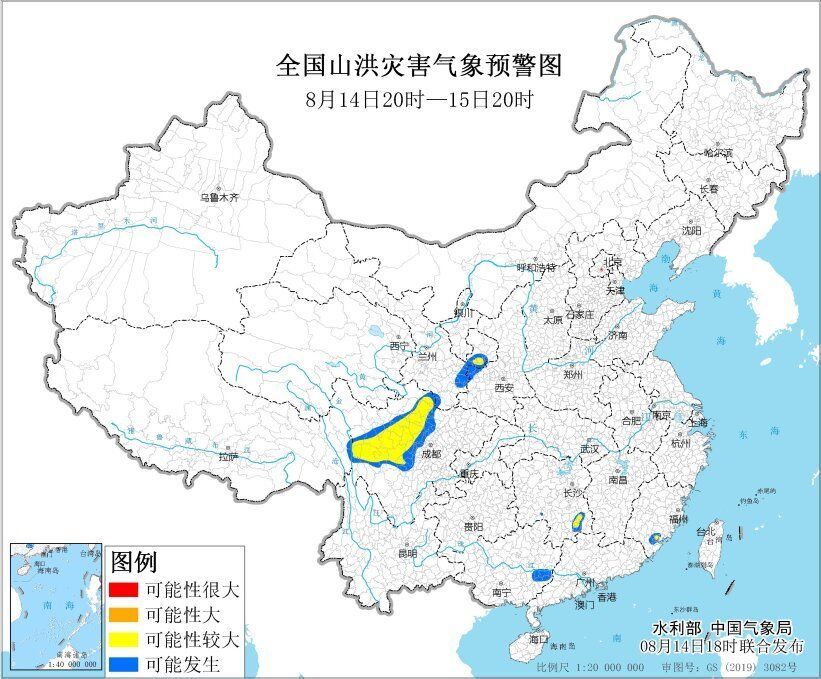 预计,8月14日20时至15日20时,福建东南部、湖南东南部和西部、广西东南部、四川中西部、西藏东部、陕西西部、甘肃东部和南部等地部分地区可能发生山洪灾害(蓝色预警),其中,福建东南部、湖南东南部、四川中西部、甘肃东部等地局部地区发生山洪灾害可能性较大(黄色预警)。其他地区也可能因局地短历时强降水引发山洪灾害,请各地注意做好实时监测、防汛预警和转移避险等防范工作。