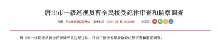 河北省唐山市一级巡视员曹全民涉嫌严重违纪违法,目前正接受河北省纪委监委纪律审查和监察调查。