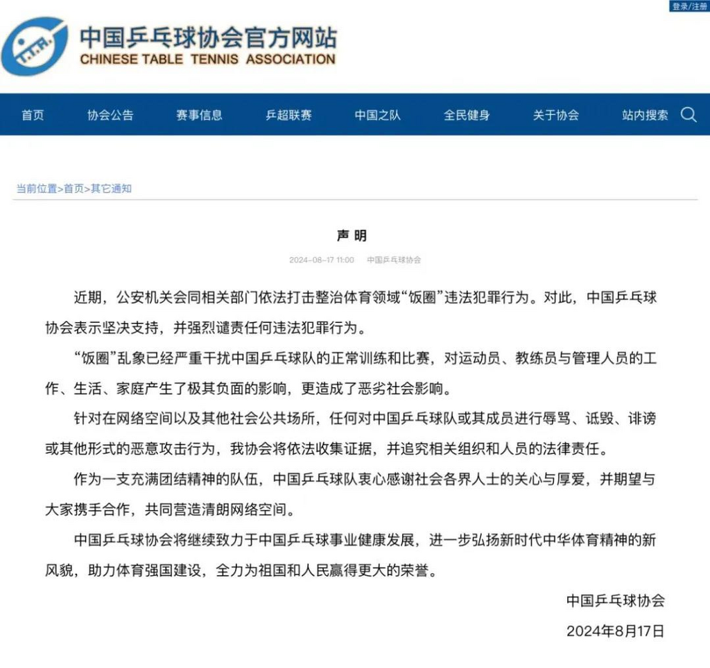 ·中国乒乓球协会发布声明:“饭圈”乱象已经严重干扰中国乒乓球队的正常训练和比赛,将依法追责。