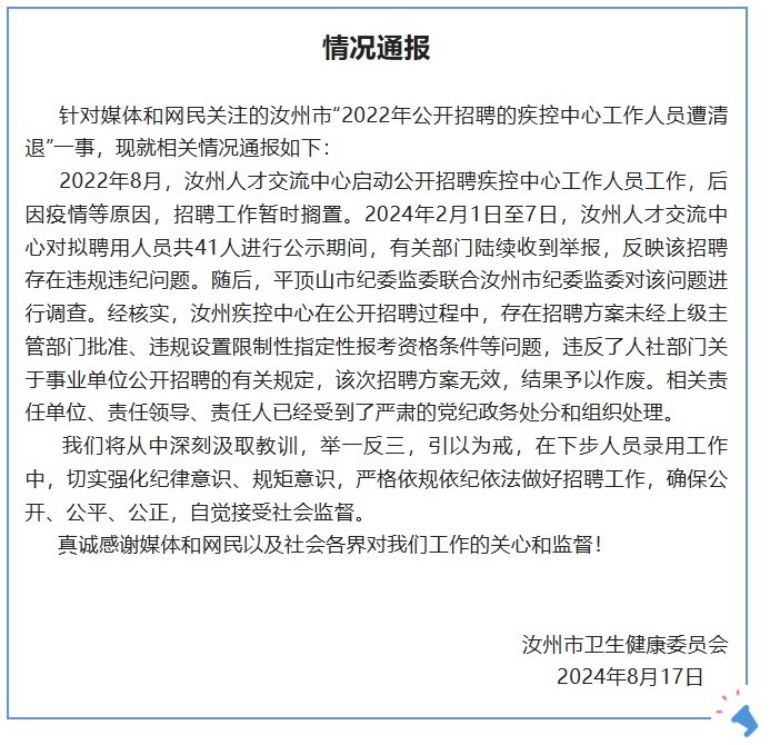 ·河南汝州疾控中心41人入职后遭清退?官方通报。