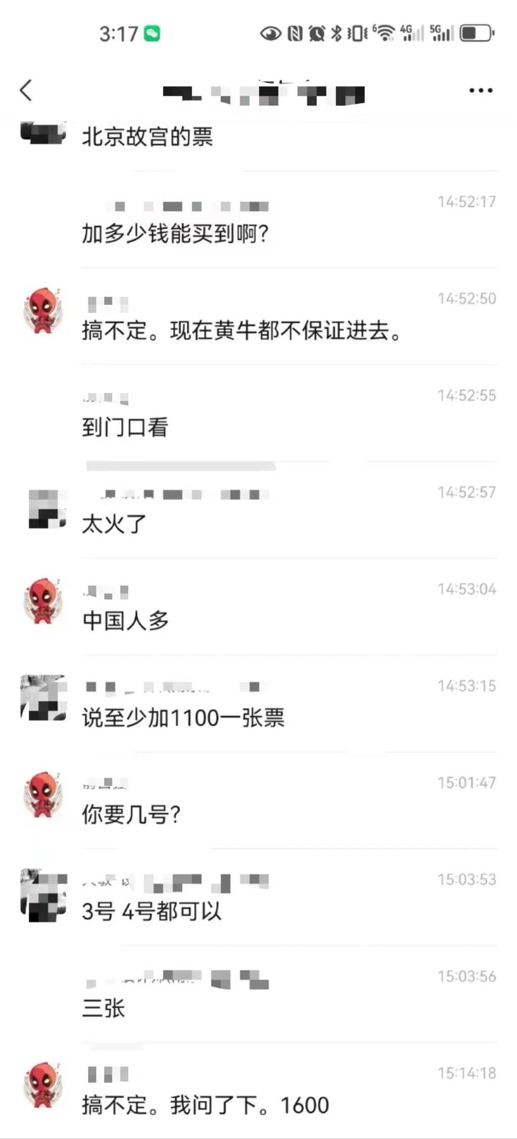 7月底,记者还曾在北京北土城公交站遇到几位河南游客。他们是老两口、小两口加上孩子一共5人来北京旅游,并去了故宫。孩子爸爸告诉记者,来之前一直抢故宫门票未果。为了此行不留遗憾,孩子妈妈在网上找黄牛买的票,一张加价100元。“毕竟每个来北京的游客都想去故宫,多花500元也算能接受吧。”他说。