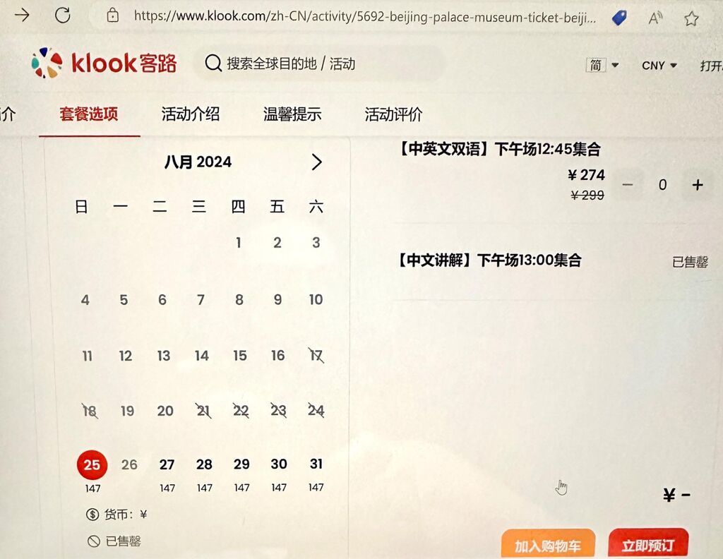 至于少数无保障的纯预约门票,往往并不能顺利预订。记者在旅游平台KlooK客路上看到有标价84元的故宫门票,但最早的预订日期已经是8月31日,那时候即将开学,门票将不会如暑期那般紧俏。而另一个标价147元的“故宫门票+景山门票+讲解”套票,则是8月25日至31日都可以预订。但当点击预订的时候,会发现实际价格变成了274元,其中暑期门票只要5元的景山门票更像个添头。