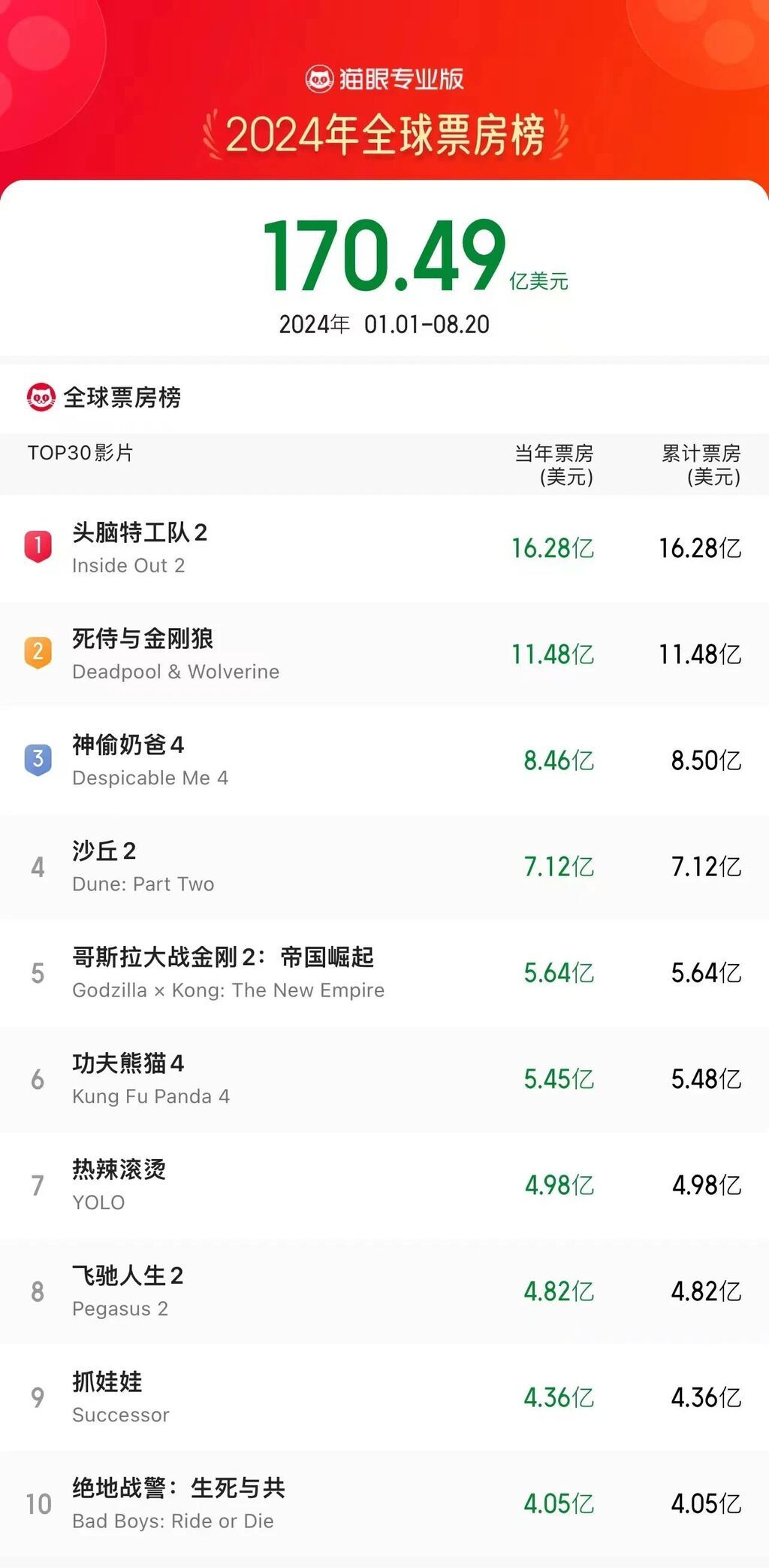 在2024年全球电影票房榜前十名中