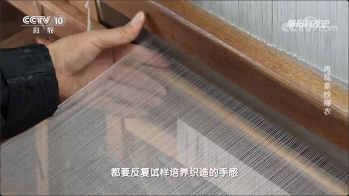 除了给蚕宝宝“减肥”,素纱襌衣的仿制还涉及到装机、纹样、织造、脱胶、染色、剪裁等工序,为此,制作团队量身定制了一台手工织机,并邀请经验丰富的织工师傅,由于要控制织造过程中的经纬疏密度,师傅们提前花了几个月提前训练手感,每个工作日只能织10厘米,耗时1年半才完成素纱的织造。