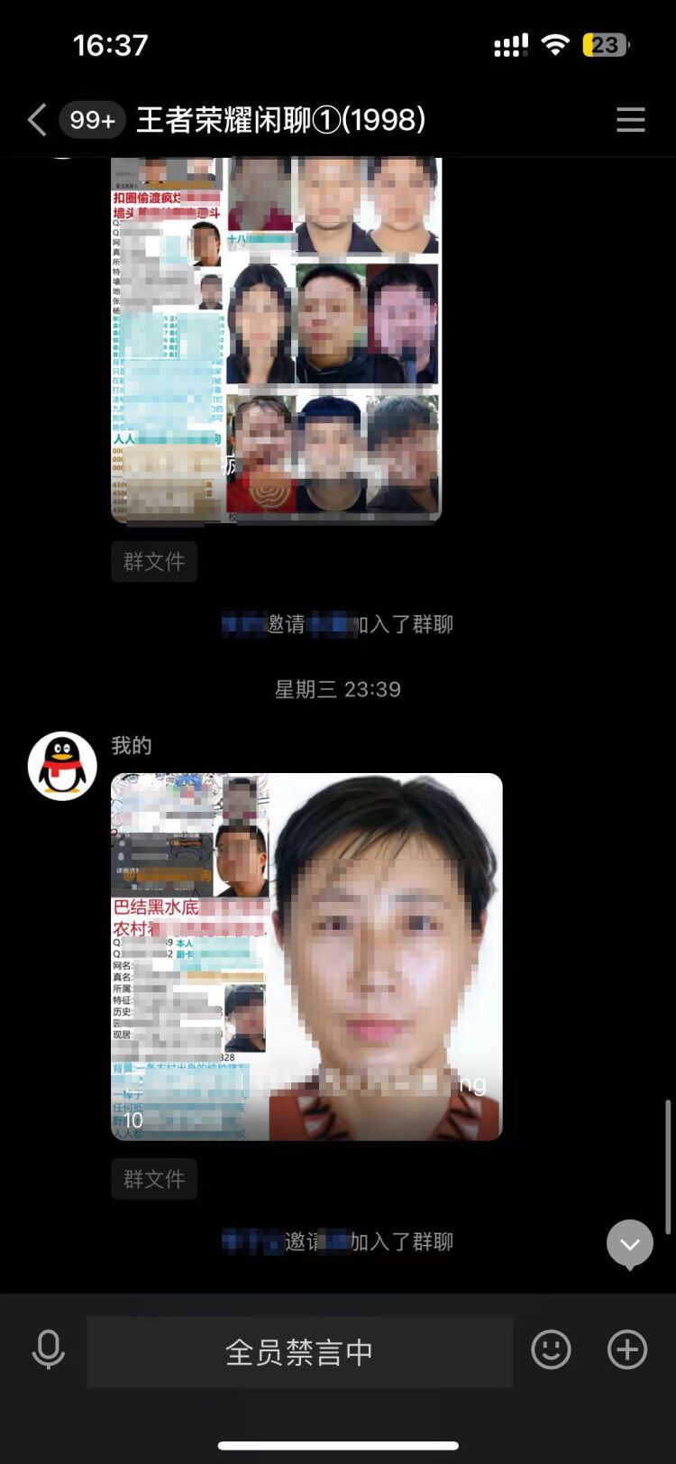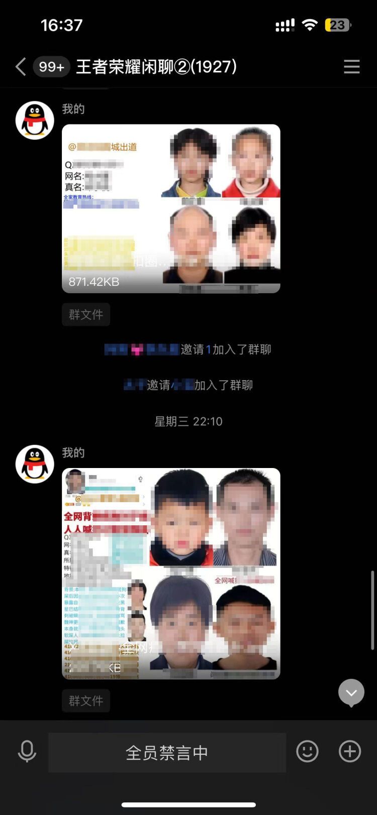 4月下旬,澎湃新闻记者进了三个名为“英雄联军闲聊”(后更名为“王者荣耀闲聊”)的QQ群,它们当时建群均有两个多月,每个群有六百多到一千余人。据知情人介绍,这是占奕专门发开盒信息的QQ群。