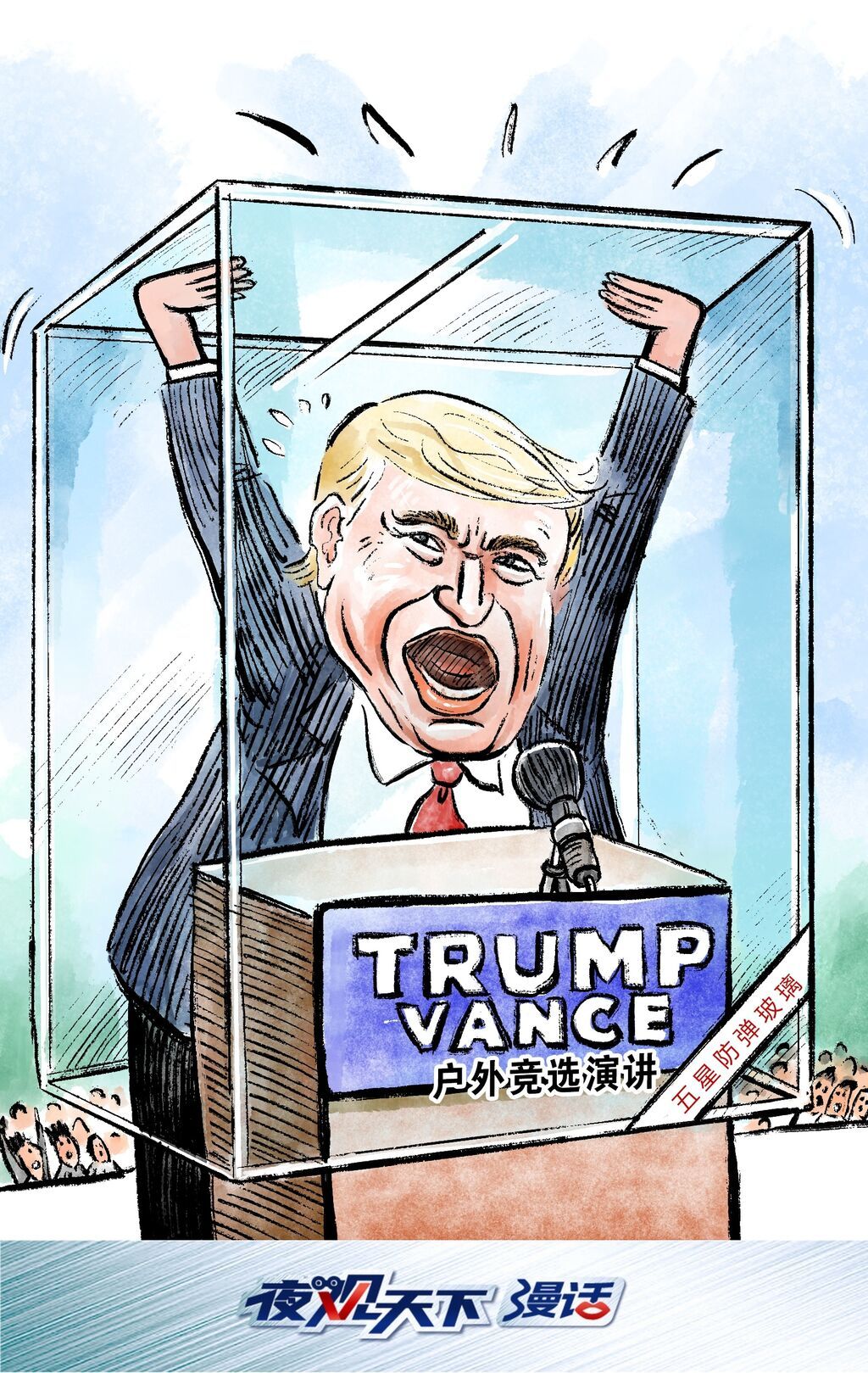 特朗普当天在装有防弹玻璃的讲台后发表演讲,现场还放置有储物箱以充当“墙壁”,阻挡视线,另有狙击手在会场的屋顶上待命,讲台后面还停有一架老式飞机。
