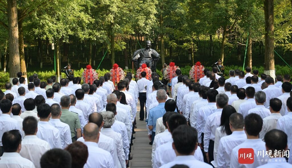 王晓晖等神情庄重,缓步上前,仔细整理花篮缎带。全场肃立,向邓小平同志铜像三鞠躬。随后,省军级领导等走到邓小平同志铜像前,绕行一周,深情瞻仰。