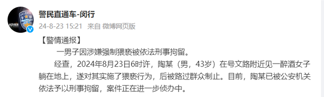 ·上海警方通报“一男子因涉嫌强制猥亵被依法刑事拘留”:案件正在进一步侦办中。