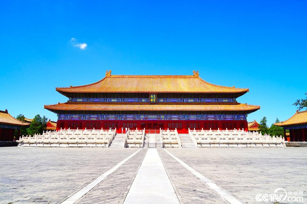 北京太庙古建区恢复对外开放,蓝天白云映衬古建巍峨。