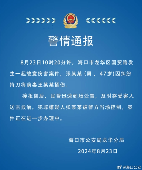 ·海口警方通报“男子持刀捅伤前妻”:犯罪嫌疑人已被当场控制。