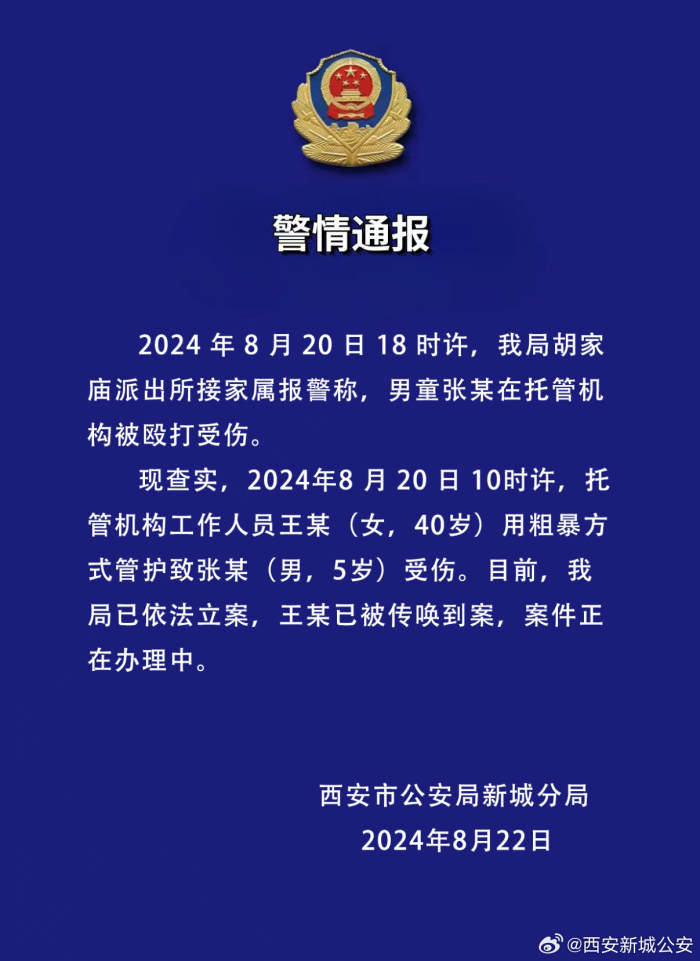 ·西安警方通报“一男童在托管机构被殴打受伤”:涉事工作人员已被传唤到案。