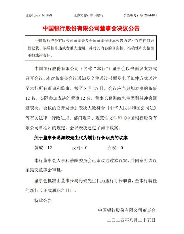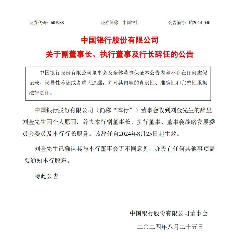 中国银行股份有限公司(简称“本行”)董事会收到刘金先生的辞呈。刘金先生因个人原因,辞去本行副董事长、执行董事、董事会战略发展委员会委员及本行行长职务。该辞任自2024年8月25日起生效。