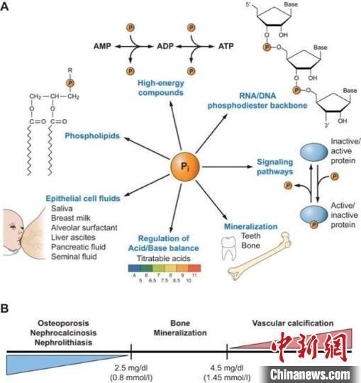 磷是人体含量第六多的常量元素,每个成年人大约含有1公斤的磷。现代研究表明,磷几乎参与生命体所有的生理进程:磷酸盐是骨骼和牙齿的主要成分;磷形成脱氧核糖核酸(DNA)、核糖核酸(RNA)、三磷腺苷(ATP)和磷脂分子的骨架;磷参与酸碱平衡;蛋白质通过磷酸化/去磷酸化作为信号调节细胞代谢。