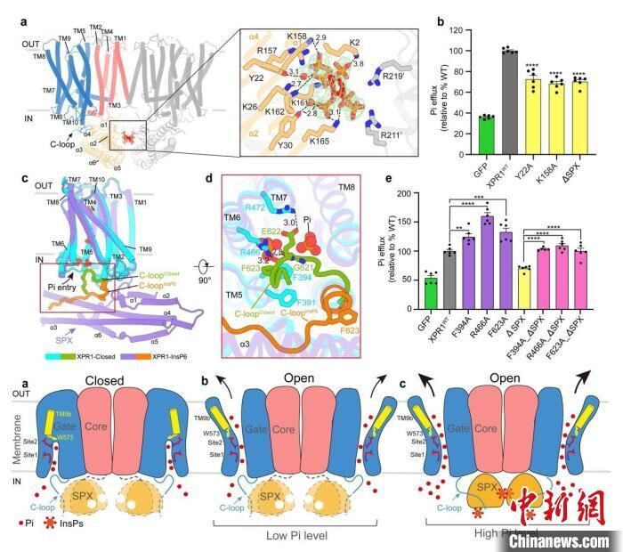 论文通讯作者姜道华特聘研究员介绍说,最初XPR1以反转录病毒的细胞表面受体出现,后续研究发现,其小小蛋白竟然“身兼数职”:它除了包含一个跨膜结构域外,还拥有一个普遍存在于动物、植物和微生物中“百搭”蛋白SPX结构域。该“百搭”蛋白作为多磷酸肌醇的感受器,及时感受细胞内因磷酸盐过量而发出“SOS”求救信号。
