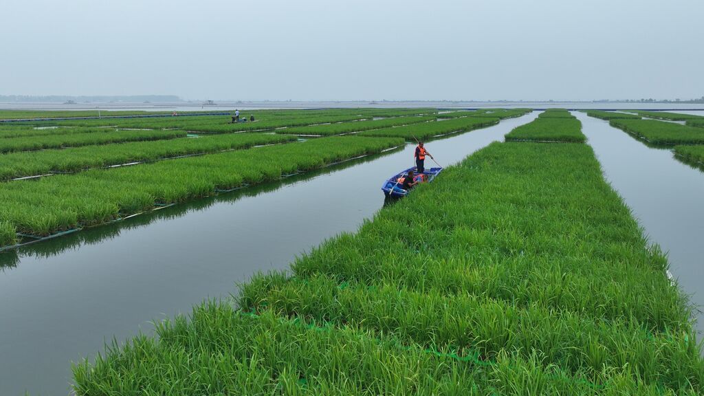 水中浮田上,沉甸甸的稻穗从稻杆中抽出后微微垂下,不时有鱼跃出水面。曾经沉寂的采煤沉陷区,如今是生机勃勃的水域。