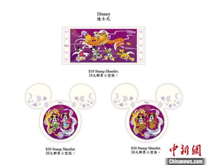 据介绍,一套六枚不同面额的邮票展示了6个穿戴传统服饰的迪士尼经典人物。10元(港元,下同)邮票小型张呈现“米奇与好友”一起舞动飞龙,20元及50元邮票小型张均特别采用“米奇”老鼠头像形状剪裁及立体压印,而50元邮票小型张更加上22K金箔烫压,极具收藏价值。
