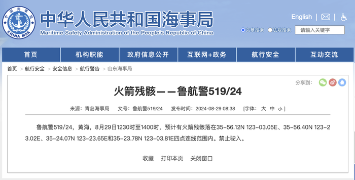 央视网消息:据中国海事局网站消息,青岛海事局发布航行警告,8月29日12时30分至14时,黄海部分海域预计有火箭残骸掉落,禁止驶入。