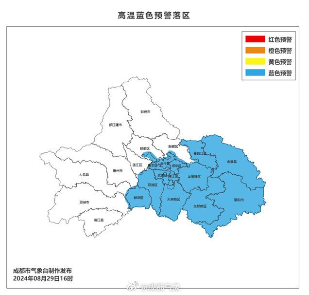 成都市气象台2024年8月29日16时00分更新高温黄色预警为高温蓝色预警:预计8月30日到9月2日成都市高温天气持续,但日最高气温有较明显下降,其中主城区、天府新区、东部新区、龙泉驿、青白江、双流、新津、简阳和金堂还将连续出现日最高气温达35℃以上的高温天气,其余区(市)县日最高气温将降至32-34℃。请注意防范。