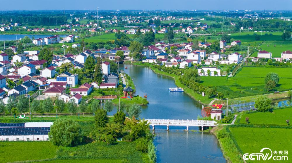 2024年8月29日,鸟瞰江苏省南通市海安市南莫镇唐庄村,绿色田野与民居、河流、道路等相映成景。