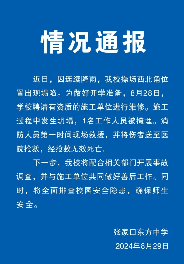 ·河北张家口一中学操场施工坍塌致1人死亡,校方通报。