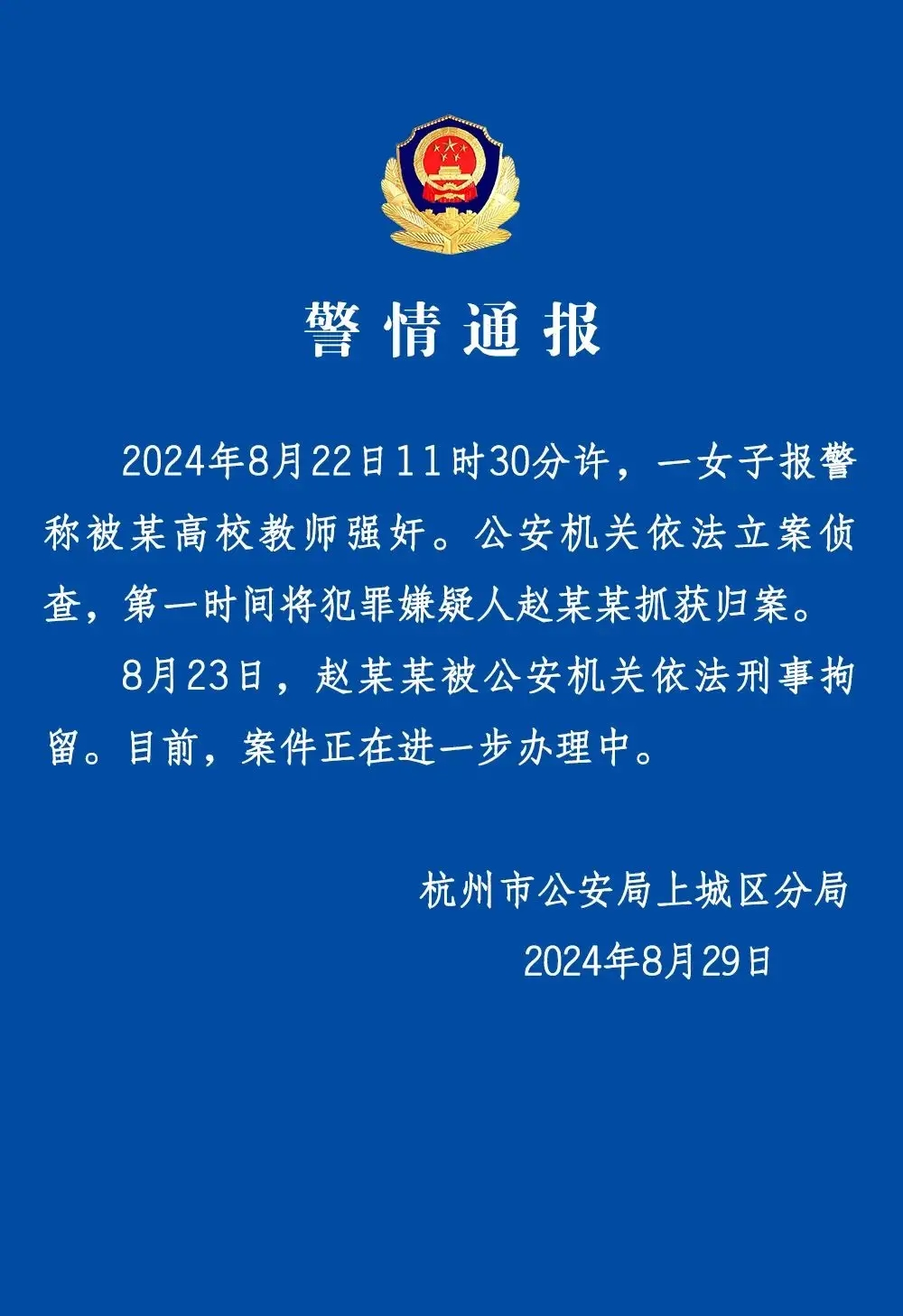 ·杭州警方通报“中国美院教授涉嫌强奸女研究生”:嫌犯已被刑拘。