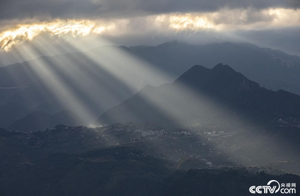 2024年8月29日,重庆,巫山县文峰景区上空现丁达尔效应,光影映照下的景区美不胜收。