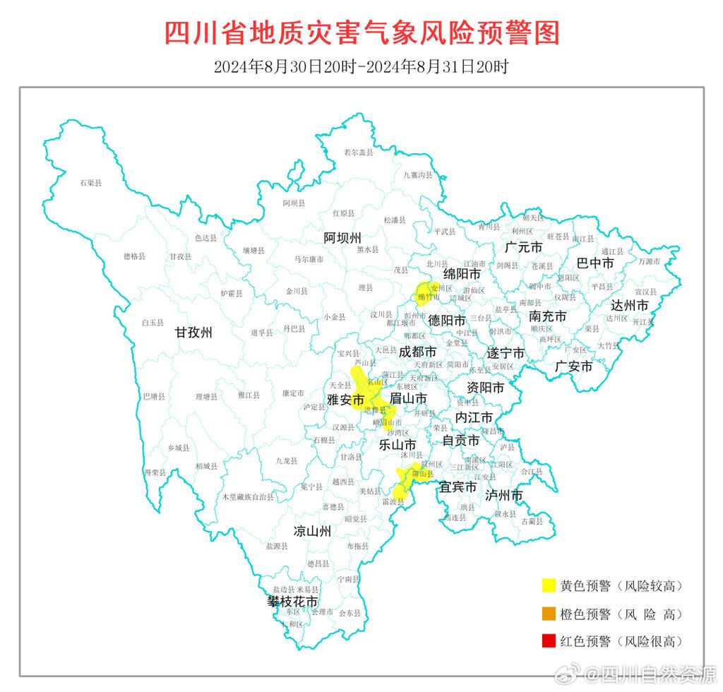 根据四川省气象台天气预报情况,结合四川省地质环境条件,8月30日20时至8月31日20时,全省地质灾害气象风险预警结果如下: