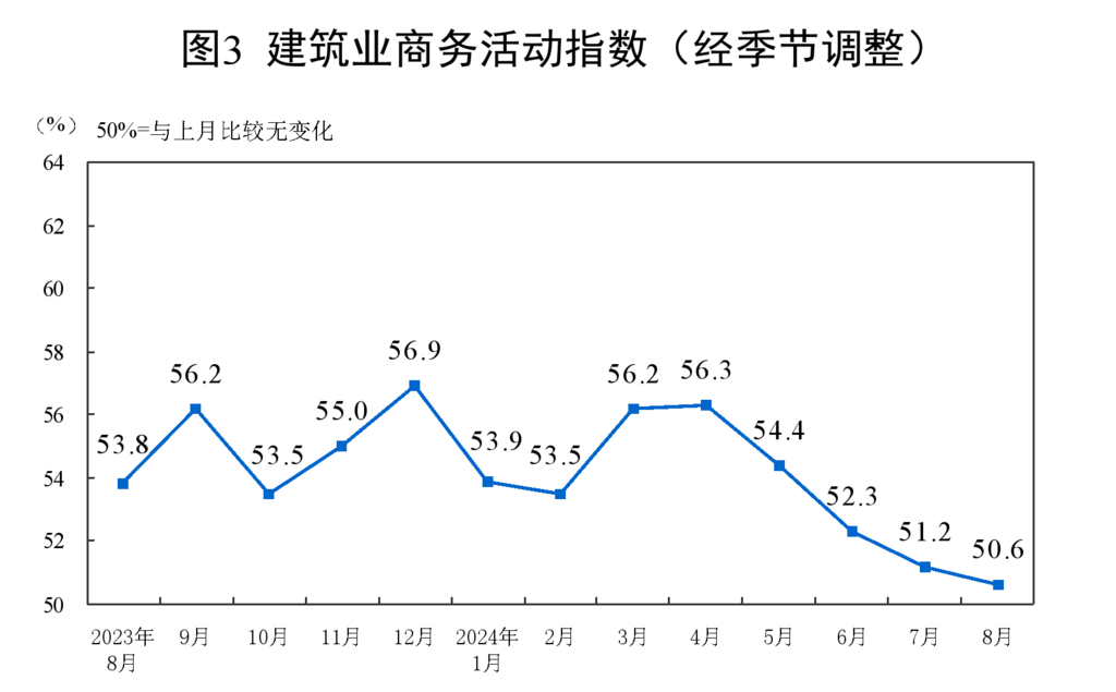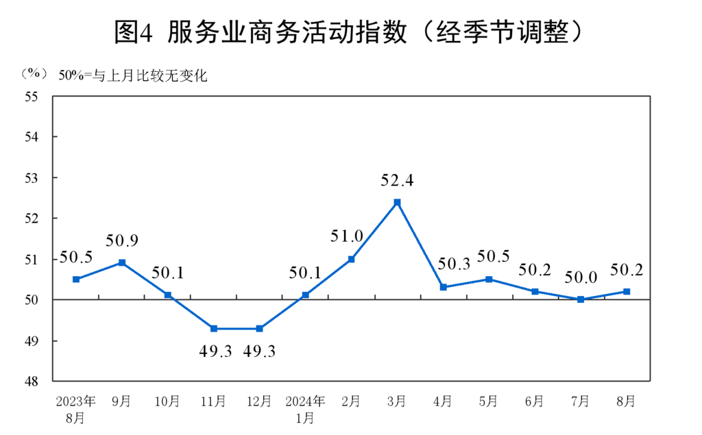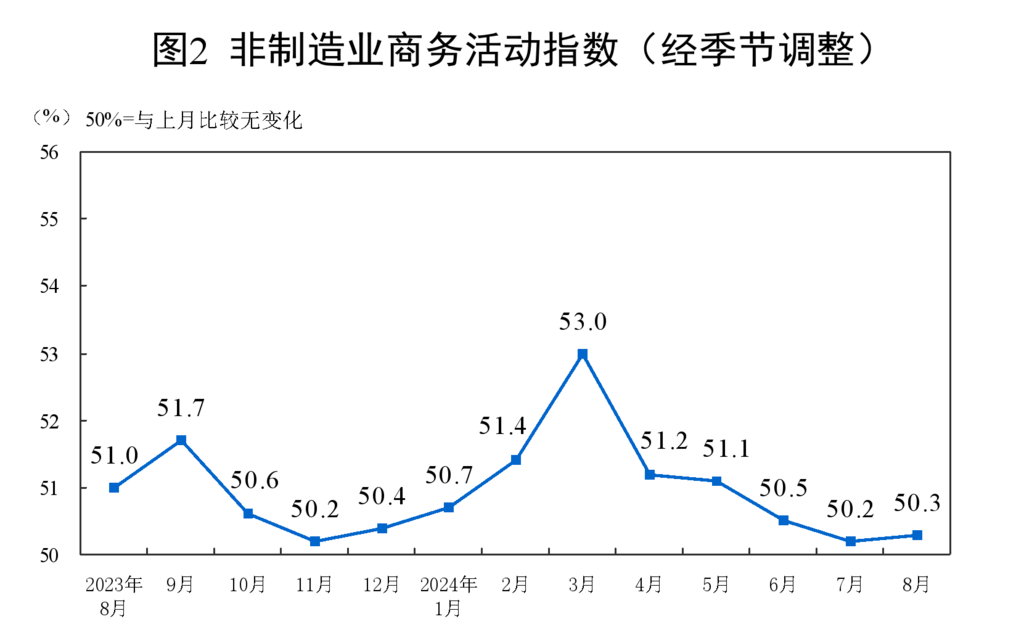 8月份,非制造业商务活动指数为50.3%,比上月上升0.1个百分点,非制造业景气水平略有回升。