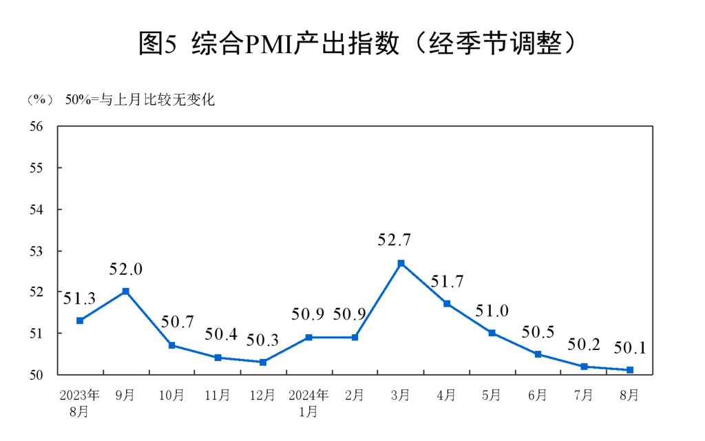 8月份,综合PMI产出指数为50.1%,比上月下降0.1个百分点,继续位于扩张区间,表明我国企业生产经营活动总体保持小幅扩张。