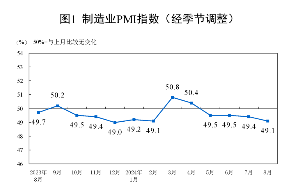 央视网消息:据国家统计局,8月份,制造业采购经理指数(PMI)为49.1%,比上月下降0.3个百分点,制造业景气度小幅回落。