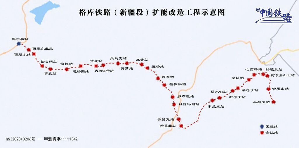 近年来,随着新疆煤炭、棉花、钢铁、矿石等物资运量迅速增长及和若铁路建成通车,格库铁路货车开行对数由初期每日2对迅速增至每日14对,既有线能力接近饱和。为进一步提升进出疆铁路通道能力,中国铁路乌鲁木齐局集团有限公司2023年9月实施了格库铁路新疆段扩能改造工程。