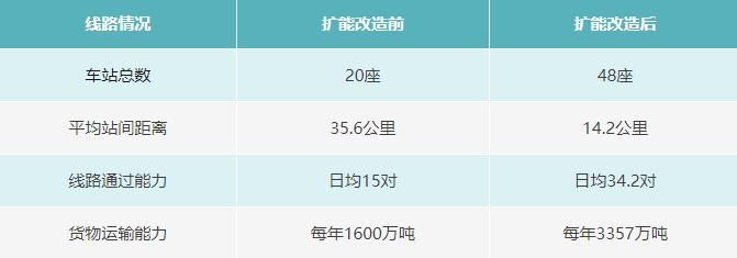格库铁路新疆段既有车站20个,其中9个车站的站间距离超过40公里。新增28座会让站开通使用后,车站平均站间距离压缩至14.2公里,最大站间距离16.9公里,“大区间”变“短区间”;线路日均通行列车由15对提升至34.2对,货物运输能力从每年1600万吨提升至每年3357万吨,有效释放了线路的列车通过会让能力。