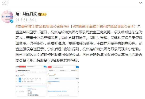 据第一财经日报报道,企查查APP显示,近日,杭州娃哈哈集团有限公司发生工商变更,宗庆后卸任法定代表人,董事长兼总经理职务,均由宗馥莉接任。同时,张晖、吴建林等多名高管退出董事、监事职务,新增叶雅琼、费军伟等为董事,王国祥为董事兼副总经理。