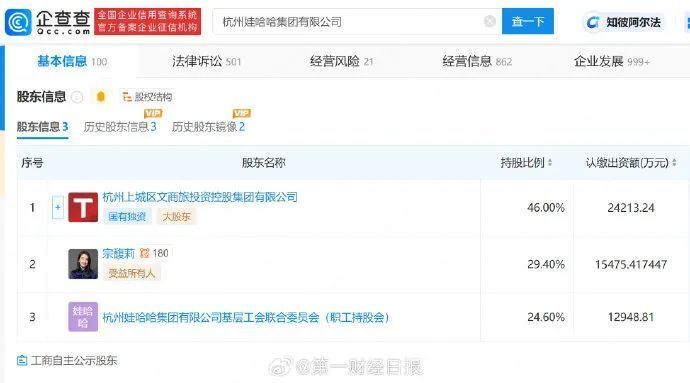 企查查股权穿透显示,宗庆后退出股东行列,杭州娃哈哈集团有限公司现由宗馥莉、杭州上城区文商旅投资控股集团有限公司、杭州娃哈哈集团有限公司基层工会联合委员会(职工持股会)3名股东共同持股。