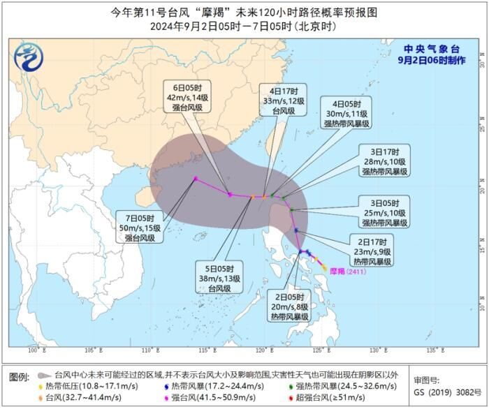 预计,“摩羯”将以每小时15-20公里的速度向偏北方向移动,强度逐渐加强,3日开始转向西偏北方向移动,并将于5日前后进入南海北部海面,最强可达强台风级或超强台风级(45-52米/秒,14-16级)。