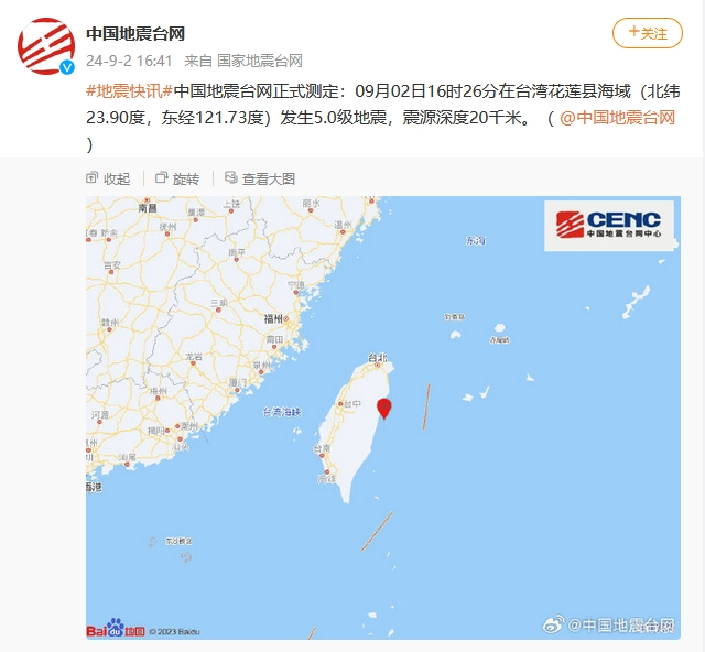 央视网消息:中国地震台网正式测定:09月02日16时26分在台湾花莲县海域(北纬23.90度,东经121.73度)发生5.0级地震,震源深度20千米。