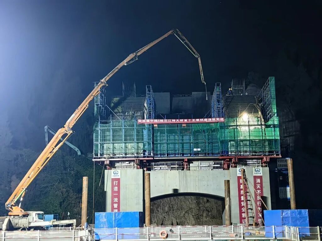近日,成渝中线高铁沱江特大桥主墩拱座浇筑顺利完成,将由墩身施工转入边拱和主拱施工阶段。