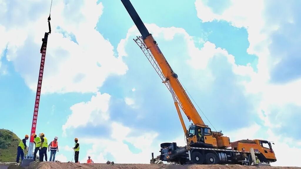 近日,在现场施工人员的精准指挥下,长达8米的H型接触网钢柱被缓缓吊起,对准基座稳稳放下,施工人员迅速完成扣铆、紧固,标志着盘兴铁路站后强电系统工程全面启动。