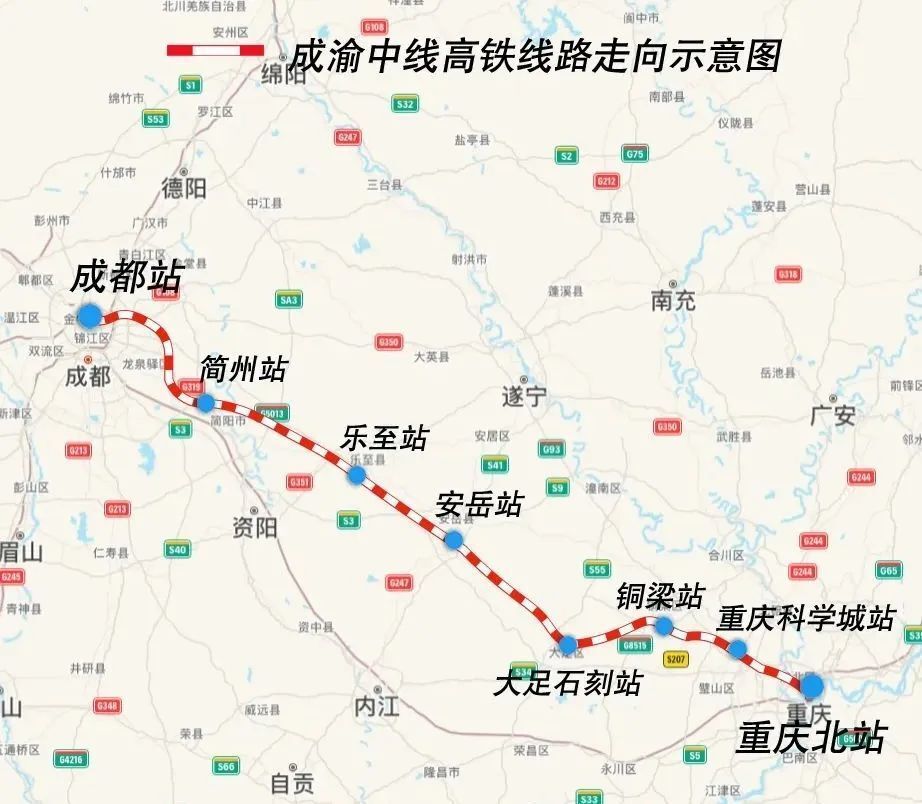 成渝中线高铁是我国“八纵八横”高铁网沿江通道的重要组成部分,线路自重庆枢纽重庆北站起,向西经重庆市渝北区、沙坪坝区、璧山区、铜梁区、大足区,四川省资阳市、成都市,引入成都枢纽成都站,正线全长292公里,设计时速350公里。
