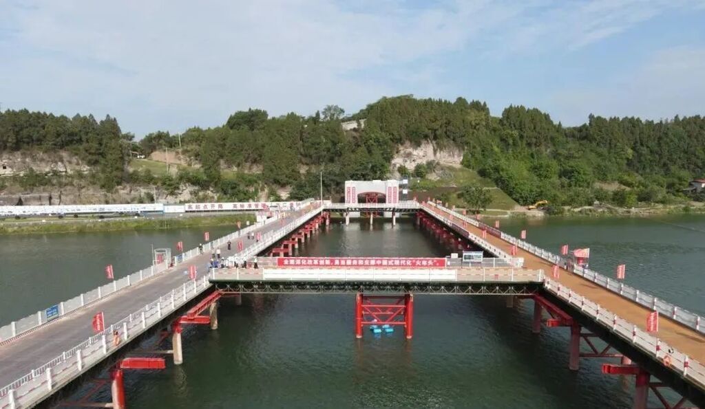 沱江特大桥位于四川省简阳市石钟镇,全长1252.25米,主桥采用中承式钢管混凝土拱桥施工,是目前在建世界最大跨度的无推力组合拱桥。该大桥具有结构体系转换复杂,钢梁、钢拱拼装线形及合拢精度控制难度大的特点,主桥跨越沱江,施工区段被天然分割,交通不便。