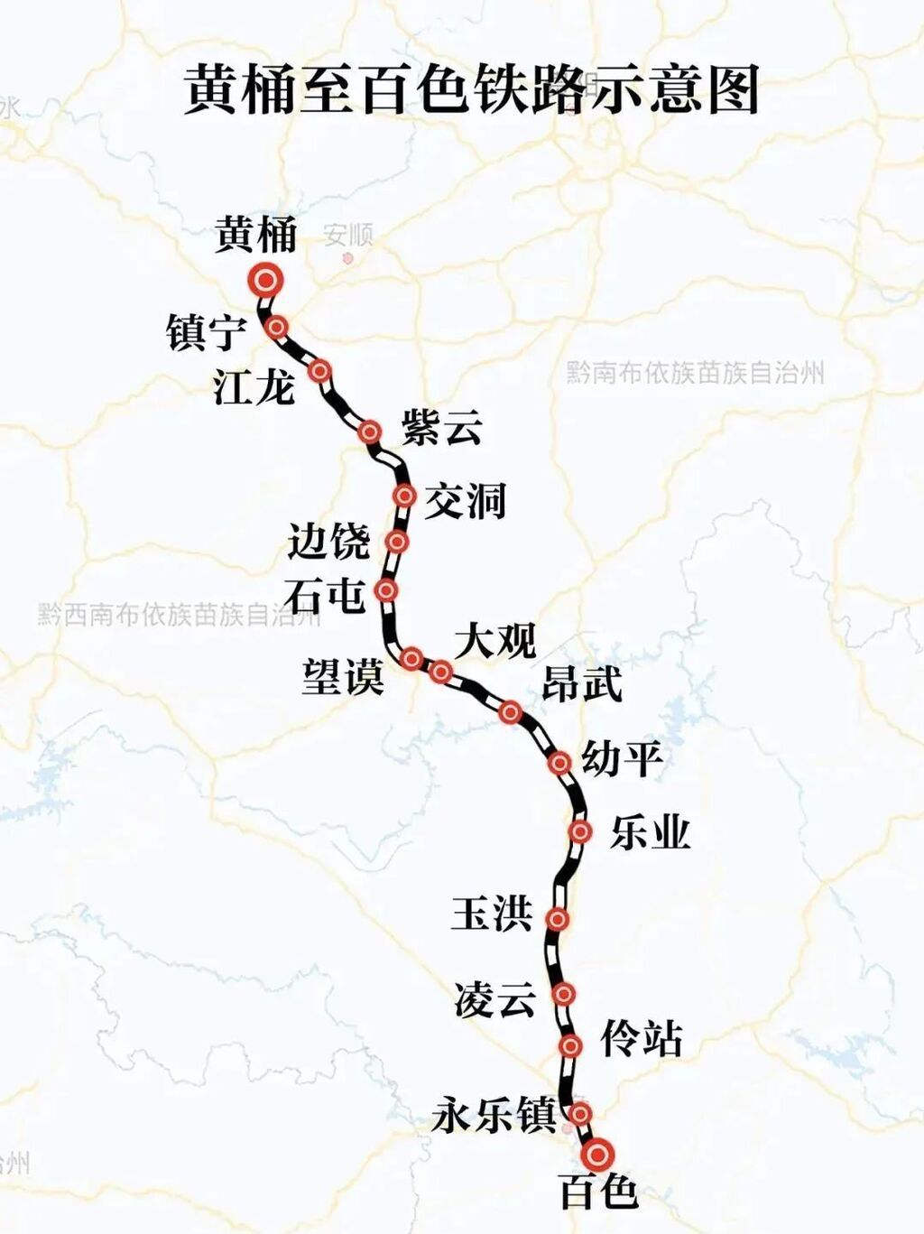 黄百铁路北接沪昆铁路,南连南宁至昆明铁路,是西部陆海新通道西通道的重要组成部分,沿线途经百色革命老区及苗族、瑶族、布依族等少数民族地区,正线全长约315公里,设计时速160公里,为国家Ⅰ级单线电气化铁路。